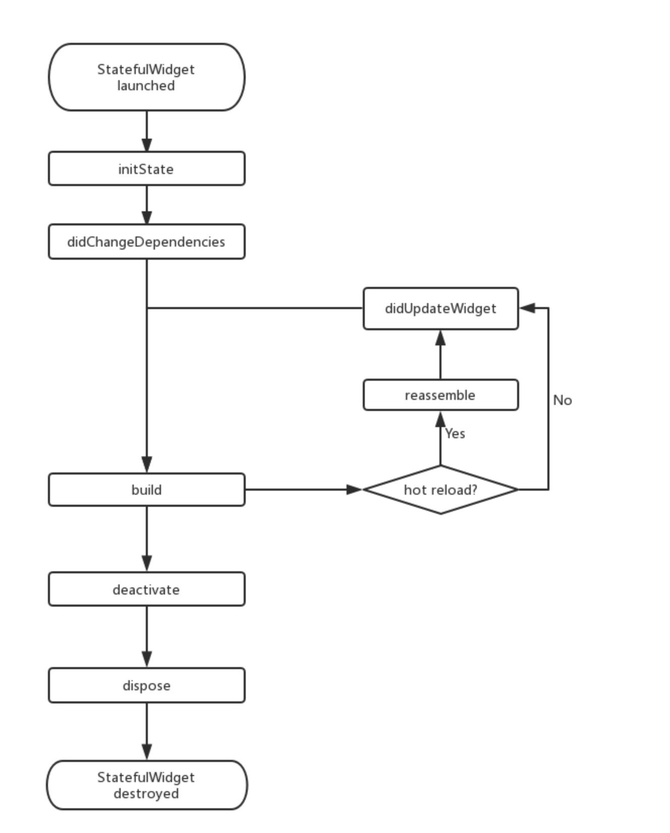 - 在 widget 生命周期中可以被改变,当State被改变时,可以手动调用其setState()方法通知Flutter 框架状态发生改变,Flutter 框架在收到消息后,会重新调用其build方法重新构建 widget 树,从而达到更新UI的目的。