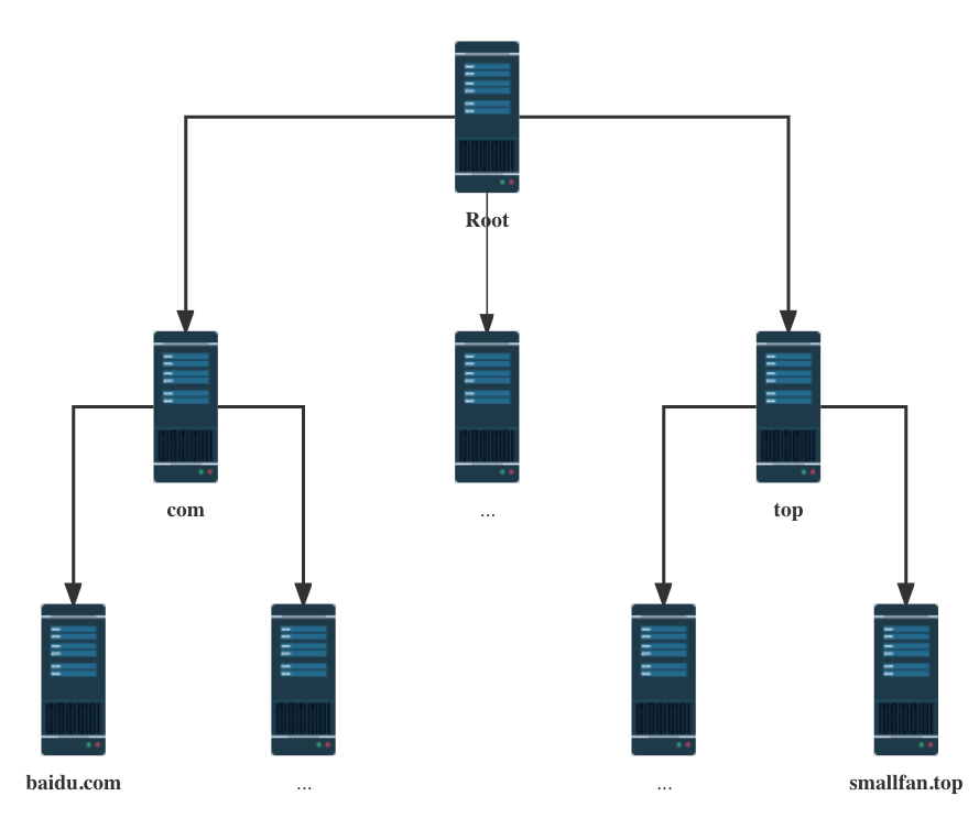 ,这里的句点代表了不同层次之间的界限。在域名中,越靠右的位置表示其层级越高。实际上域名最后还有一个点,比如 www.smallfan.top.